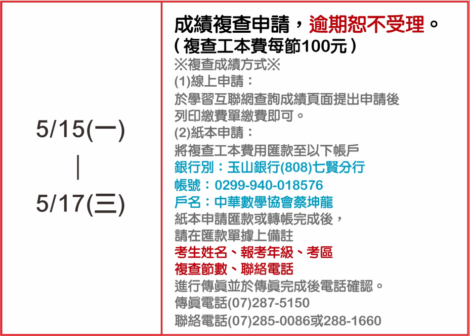 成績複查結果將於5/17(三)~5/19(五)陸續以電話通知,恕不提供答案卷(卡)