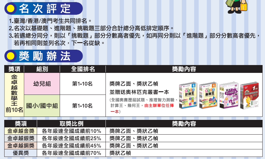 | 金卓越數學王 | 課內知識檢定 | 選擇題 | 40 | 1~20題每題三分 21~30題每題四分 31~40題每題五分 | 08:15~09:15 (60分鐘) | 150 |