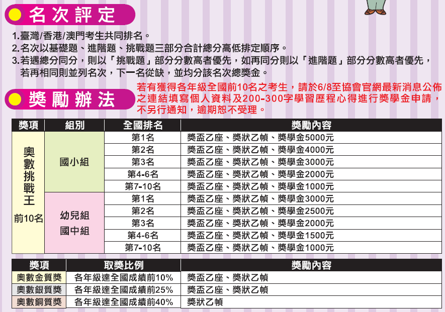 | 奧數挑戰王 | 數學競賽延伸 | 計算題 (需有計算過程) | 15 | 每題十分 | 09:30~10:30 (60分鐘) | 150 |