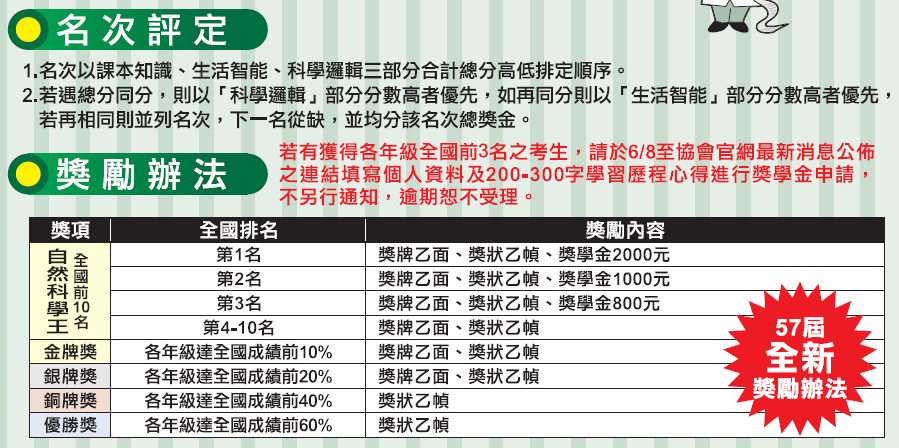 | 自然科學王 | 自然知識探究 (國小三~六年級) | 選擇題 | 20 | 每題五分 | 10:55~11:35 (40分鐘) | 100 |